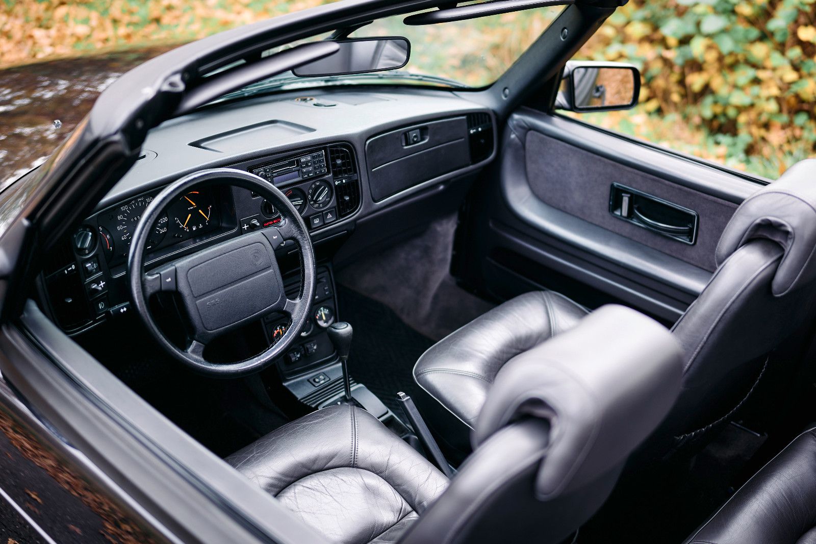 Die Lederausstattung ist dunkelgrau, die Außenfarbe Graphitmetallic ist zum großen Teil im Originallack erhalten. Das Fahrzeug ist rostfrei, erkennbar regelmäßig gepflegt und konserviert, sowie ohne erkennbaren Wartungsstau. Insgesamt ein sehr klassisches Saab Cabriolet mit tollem Motor und in einer attraktiven Farbkombination.